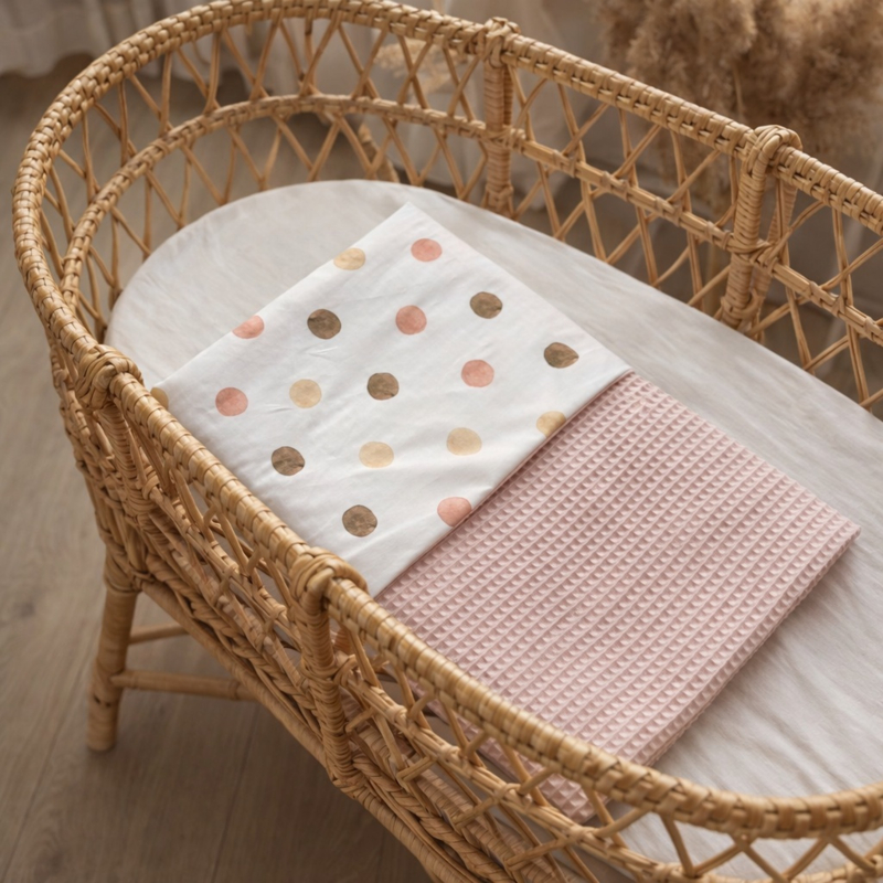 Dekentje van Wafelkatoen in de kleur dusty salmon in combinatie met katoen watercolor dots.