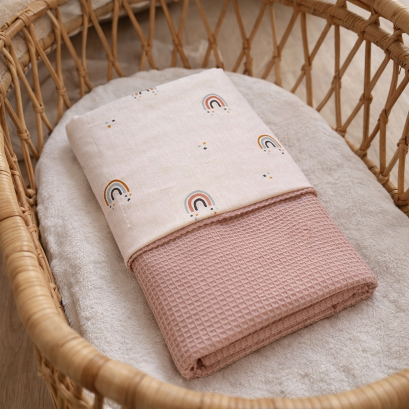 Dekentje van Wafelkatoen in de kleur poeder roze in combinatie met katoen rainbow dreams.