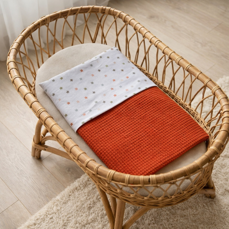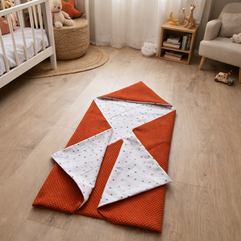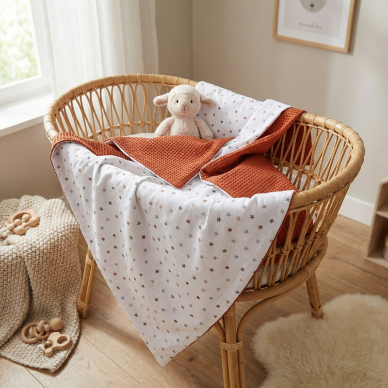 Dekentje van Wafelkatoen in de kleur terra in combinatie met katoen twinkle stars.