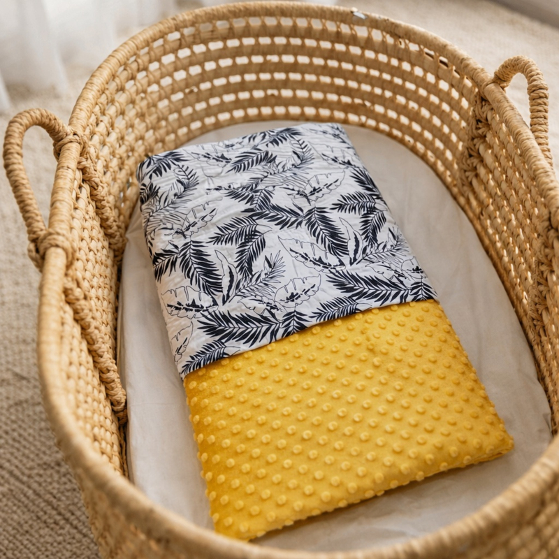 Dekentje van Minky in de kleur oker in combinatie met katoen tropical flowers.