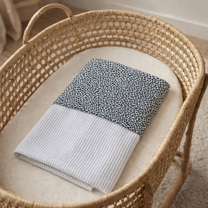 Dekentje van Wafelkatoen in de kleur licht grijs in combinatie met katoen leopard grey.