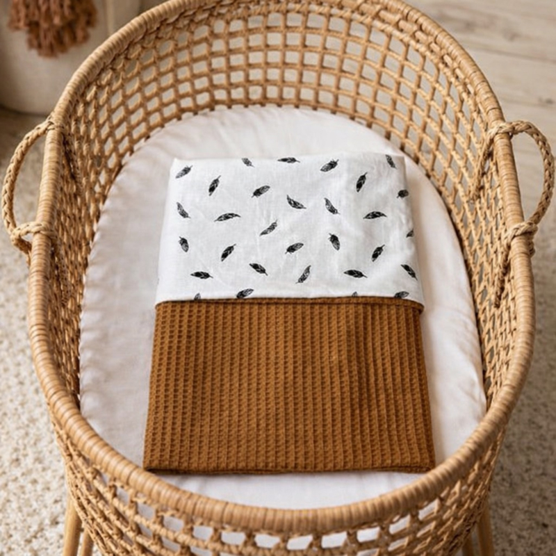 Dekentje van Wafelkatoen in de kleur cognac in combinatie met katoen veertjes.