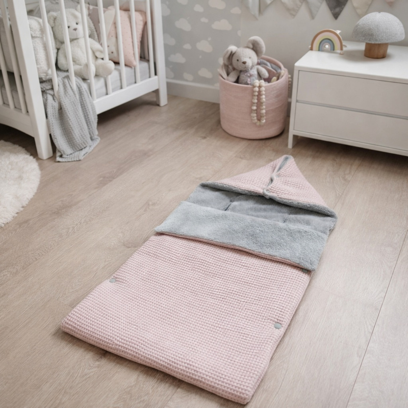 OverzichtOnze voetenzak, gemaakt van wafelkatoen poeder roze & cuddle fleece licht grijs, houdt je baby extra warm tijdens koudere dagen.