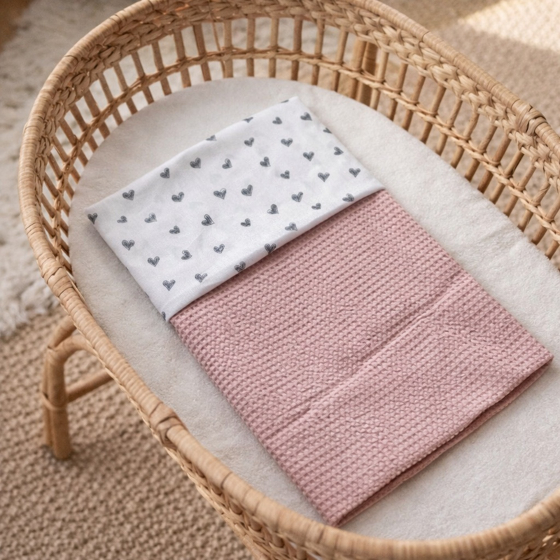 Dekentje van Wafelkatoen in de kleur poeder roze in combinatie met katoen hartjes.